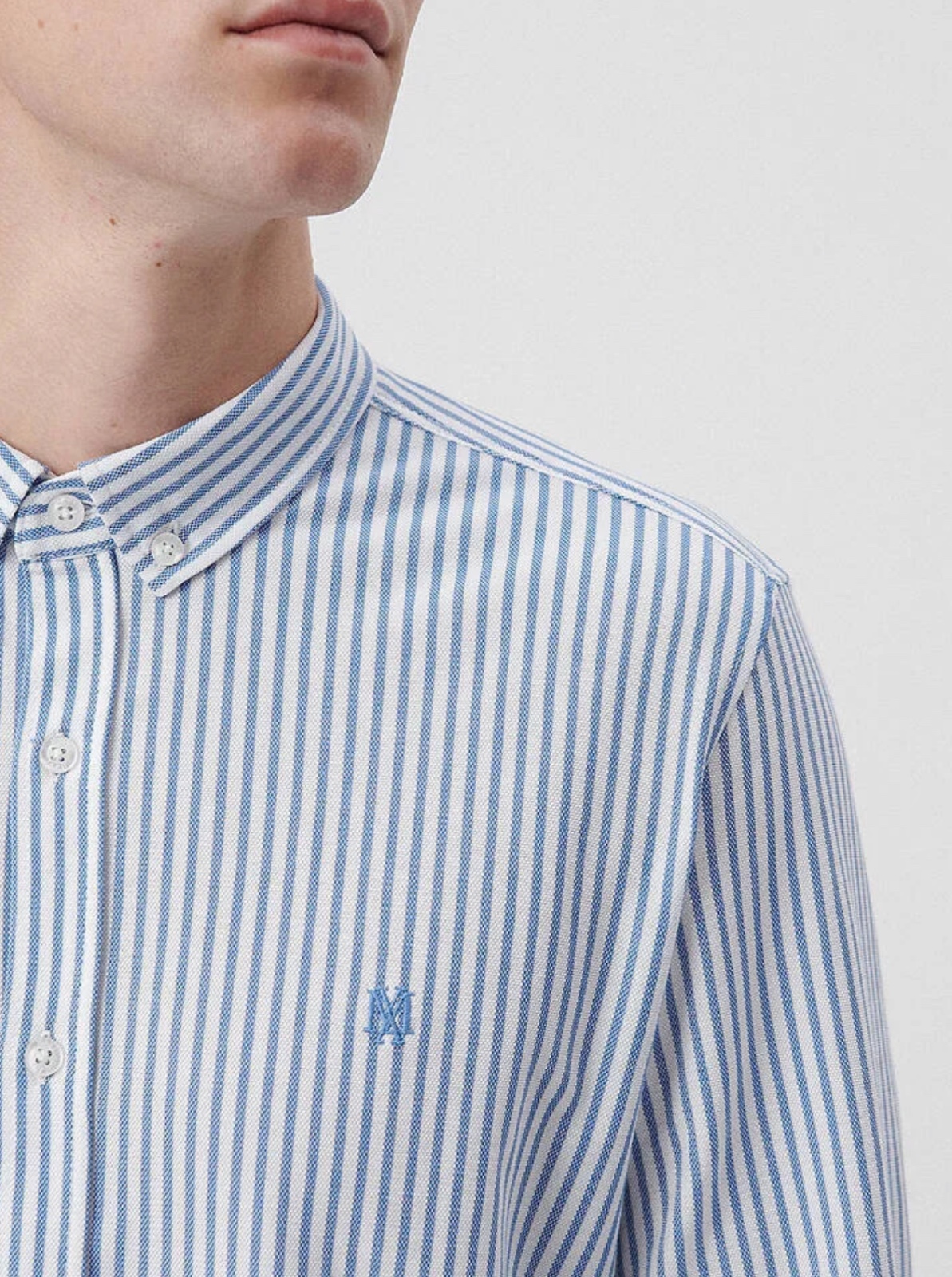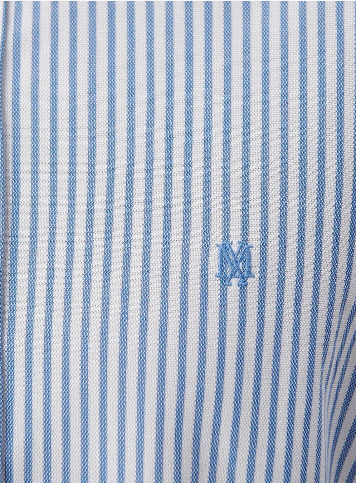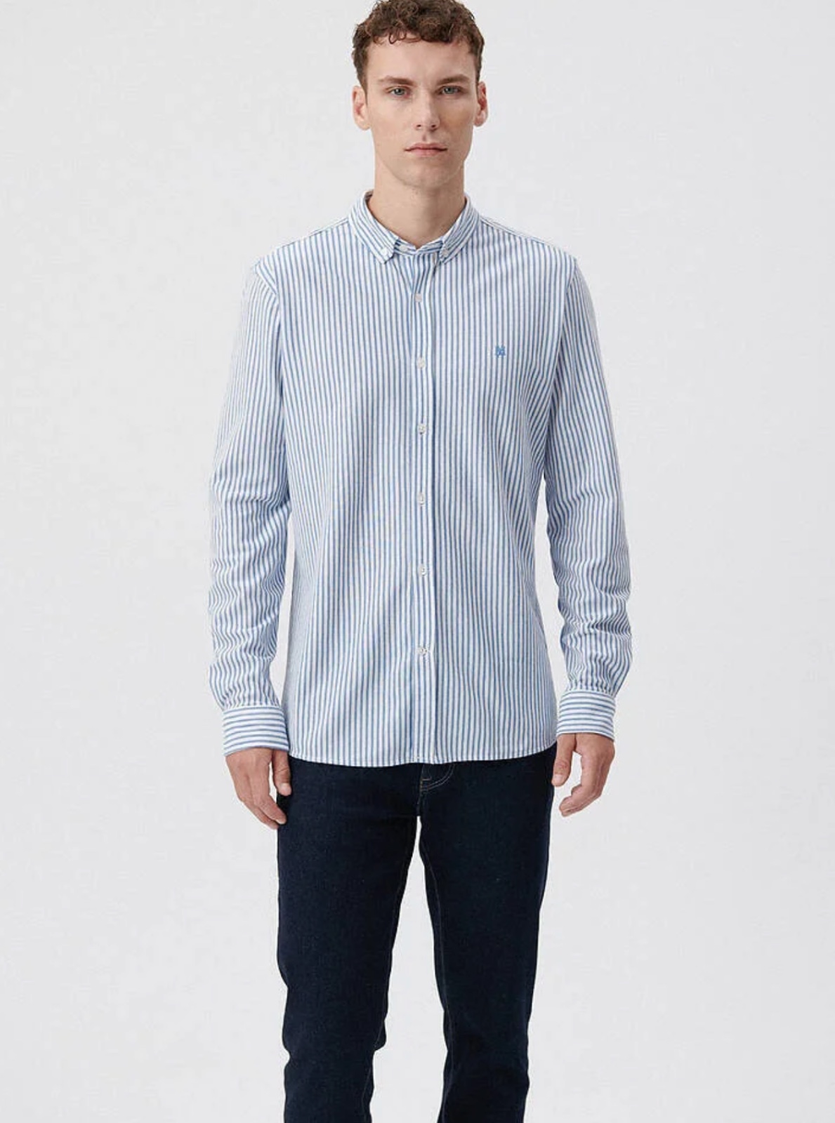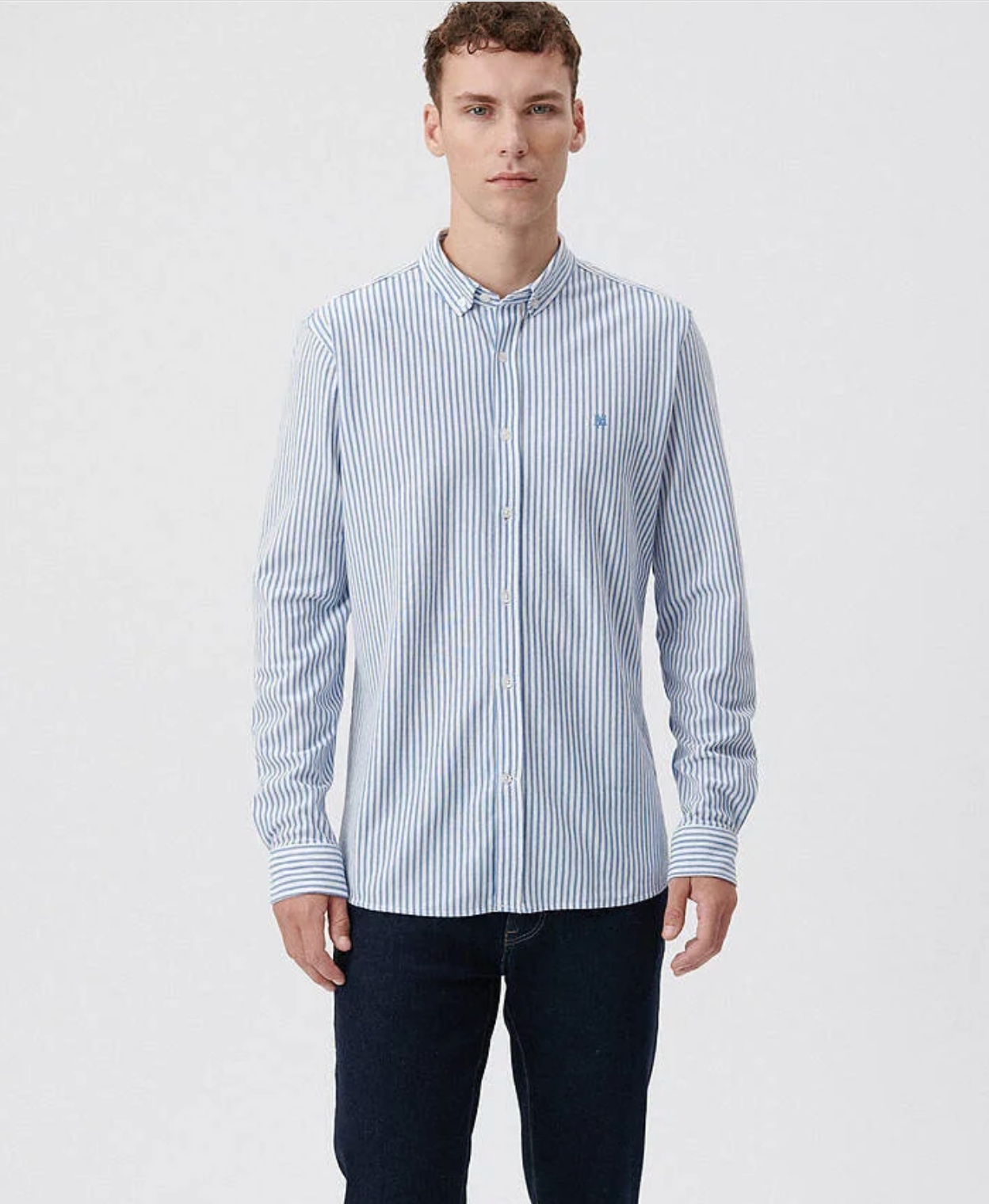 BEYAZ ÜZERİNE MAVİ ÇİZGİLİ SLİMFİT ÖRME GÖMLEK