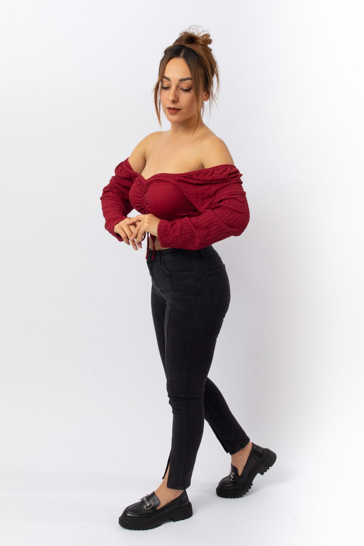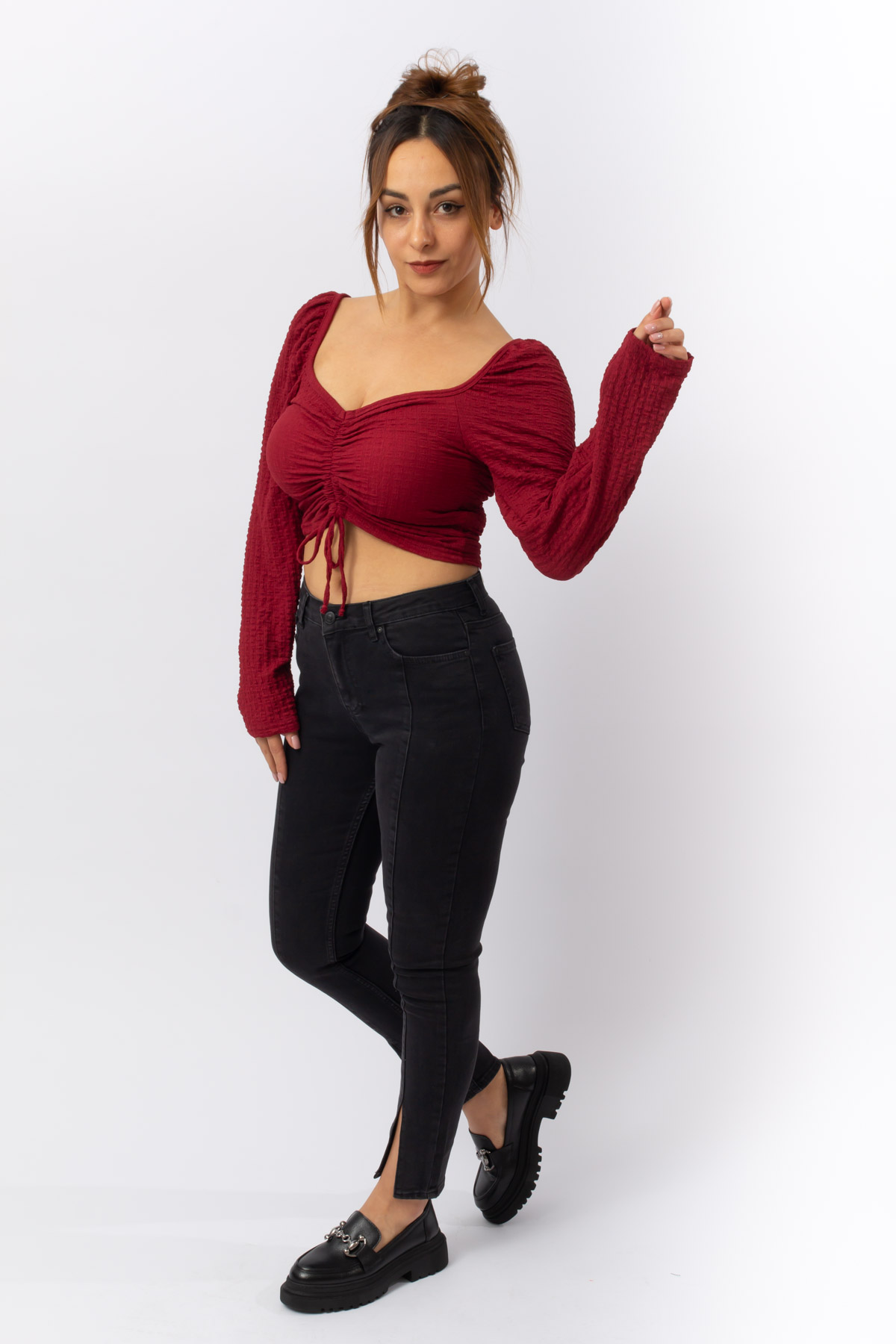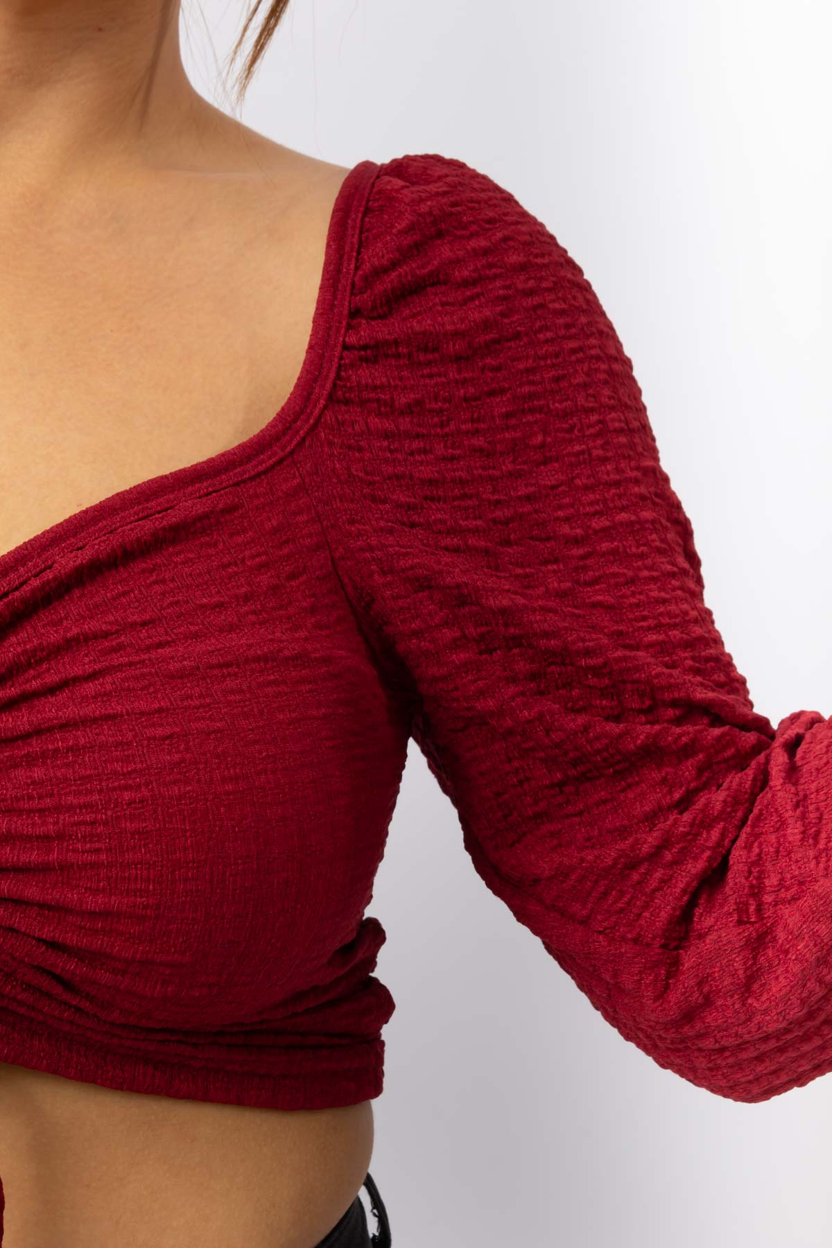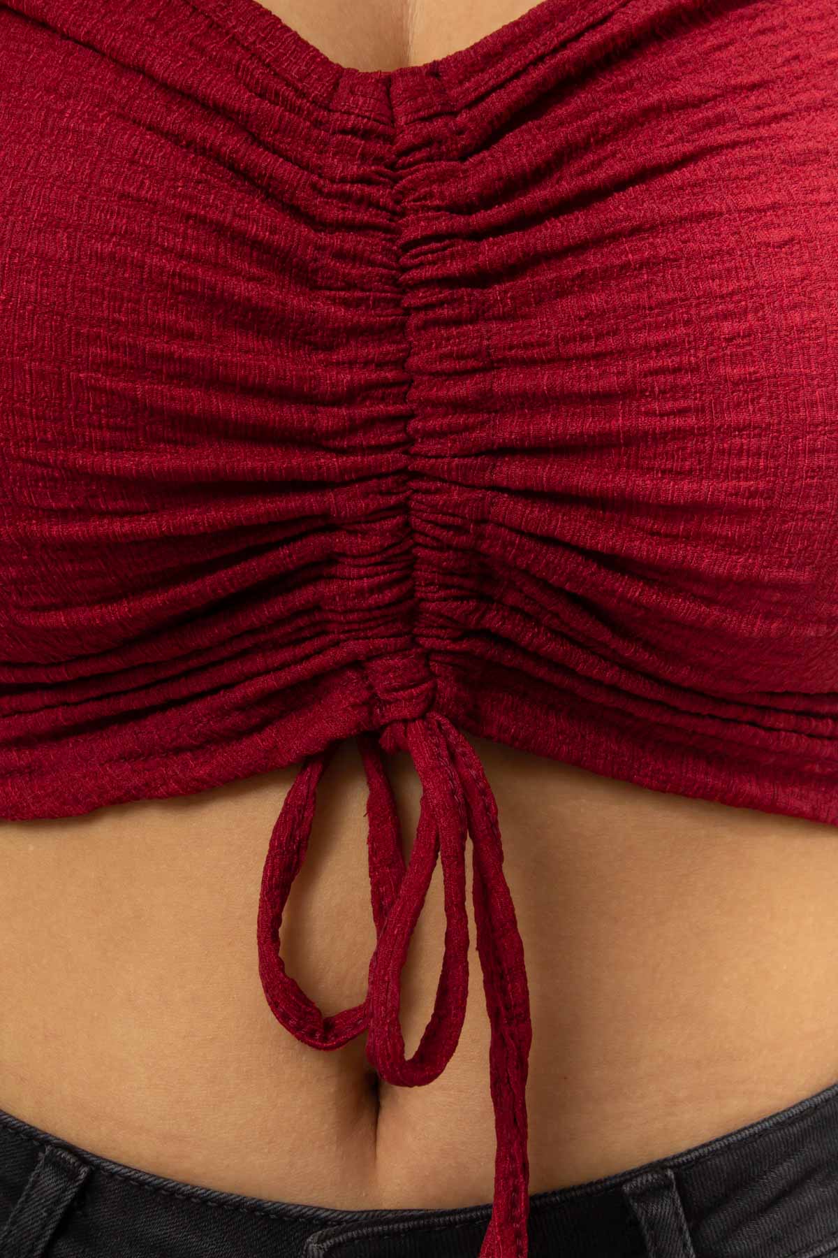 BORDO RENK İP BÜZMELİ UZUN KOL CROP