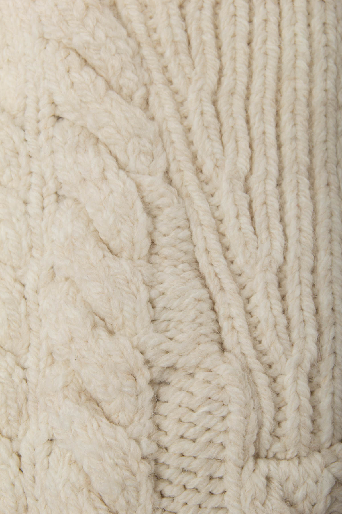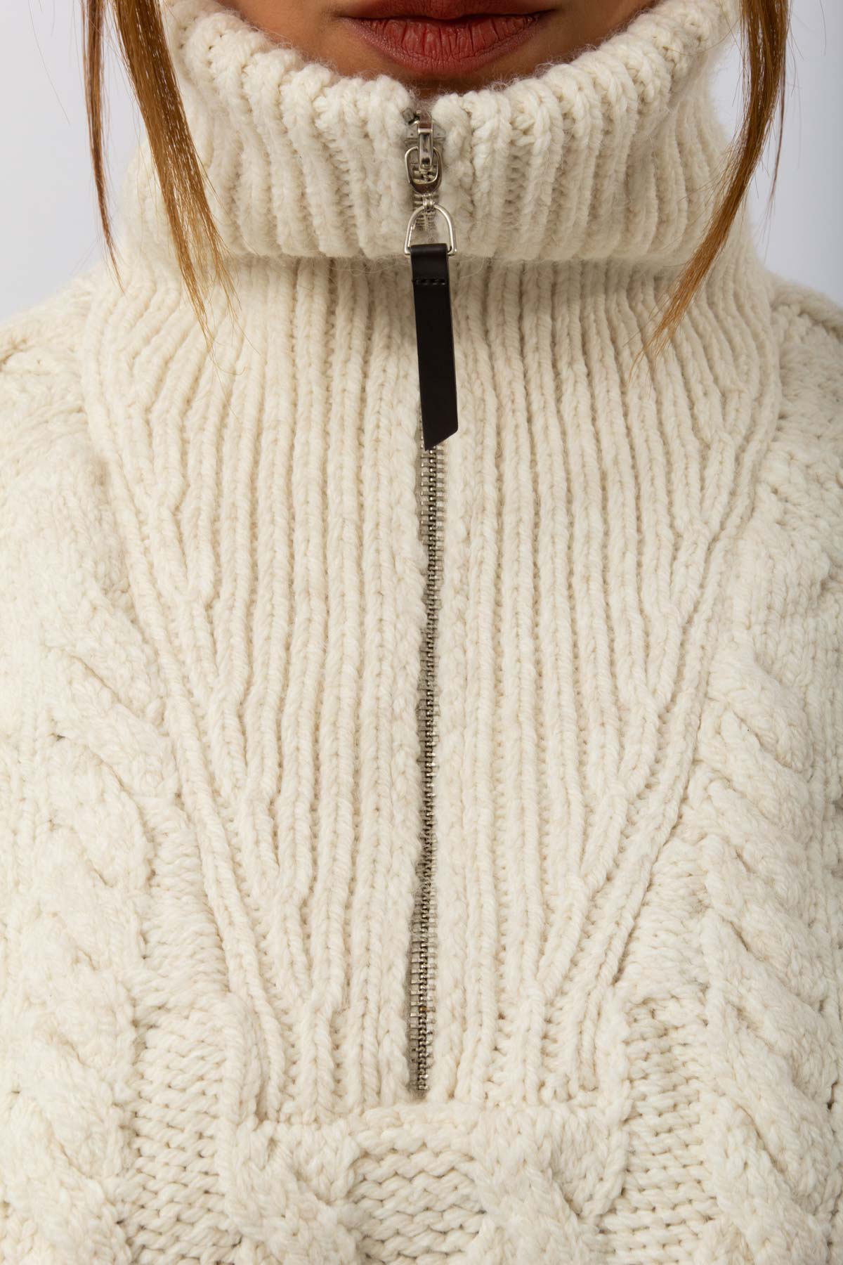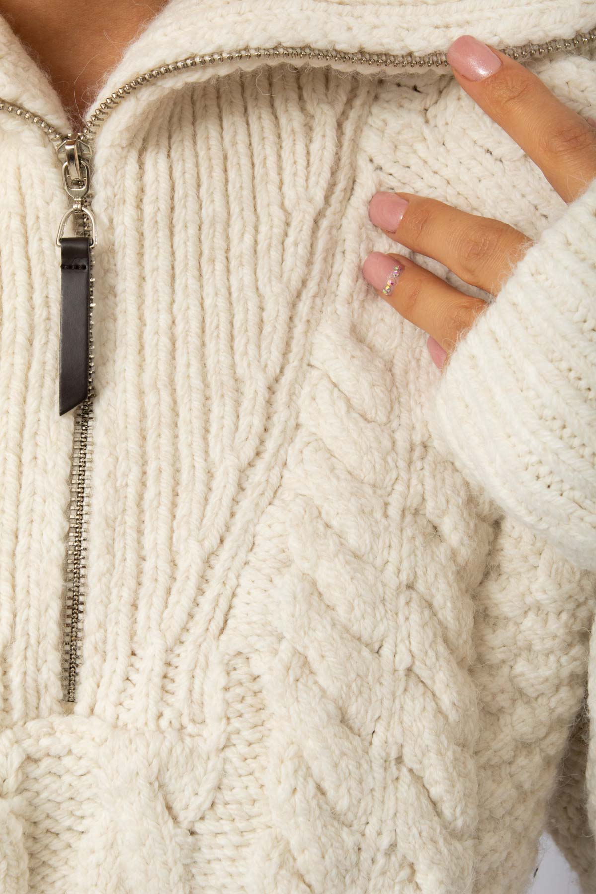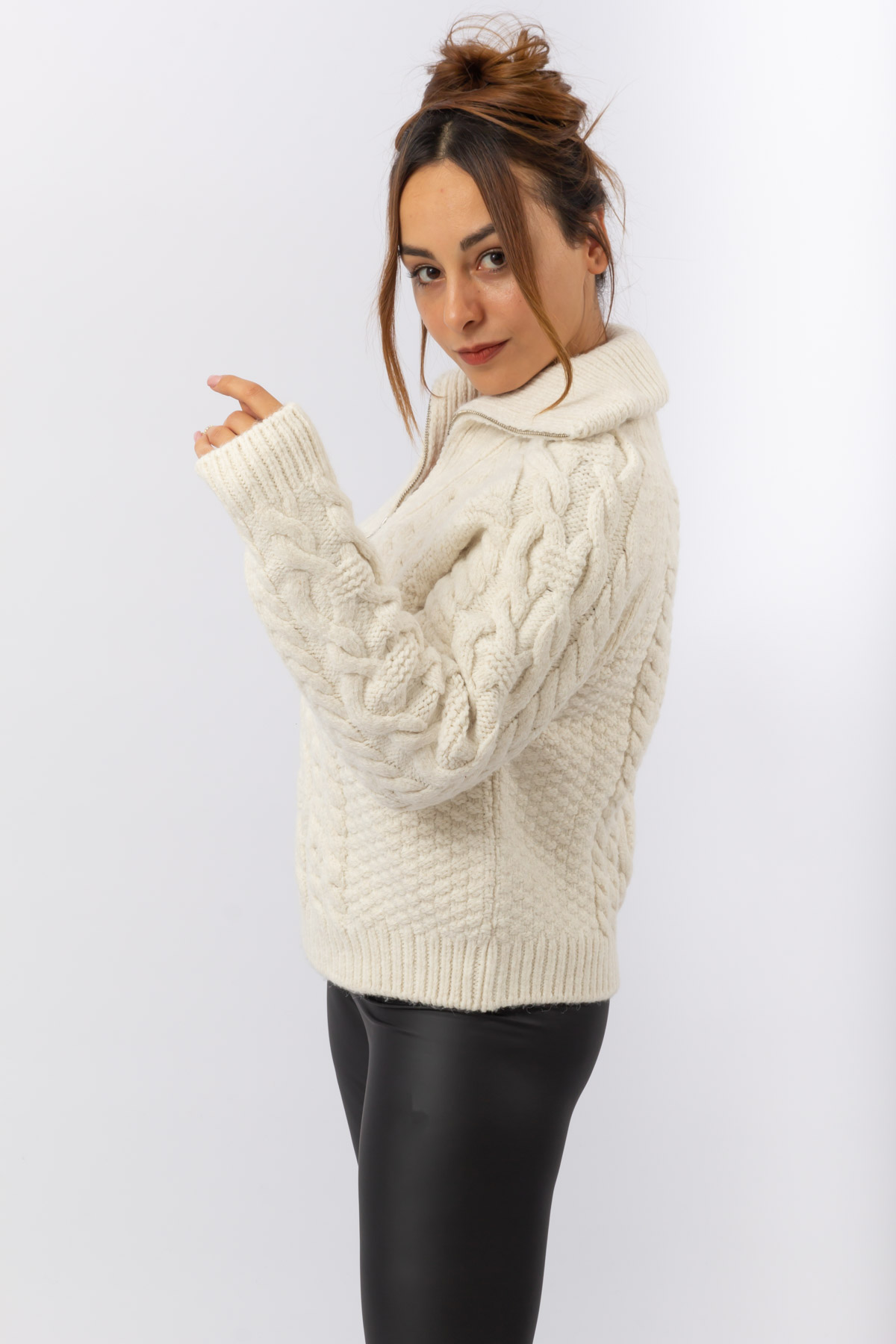 Krem Renk Fermuarlı Saç Örgü Kamyoner Yaka Kazak