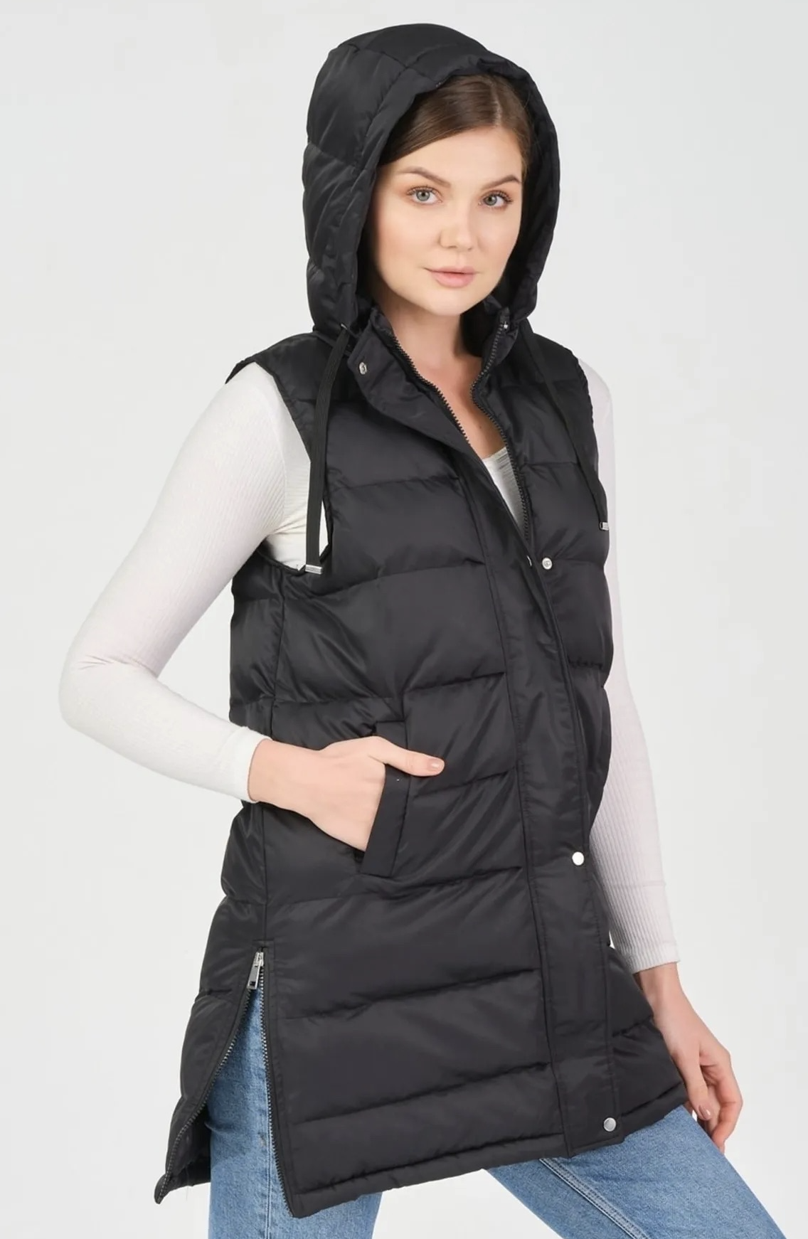 FERMUAR YIRTMAÇ BASEN BOY SABİT KAPŞONLU SİYAH YELEK