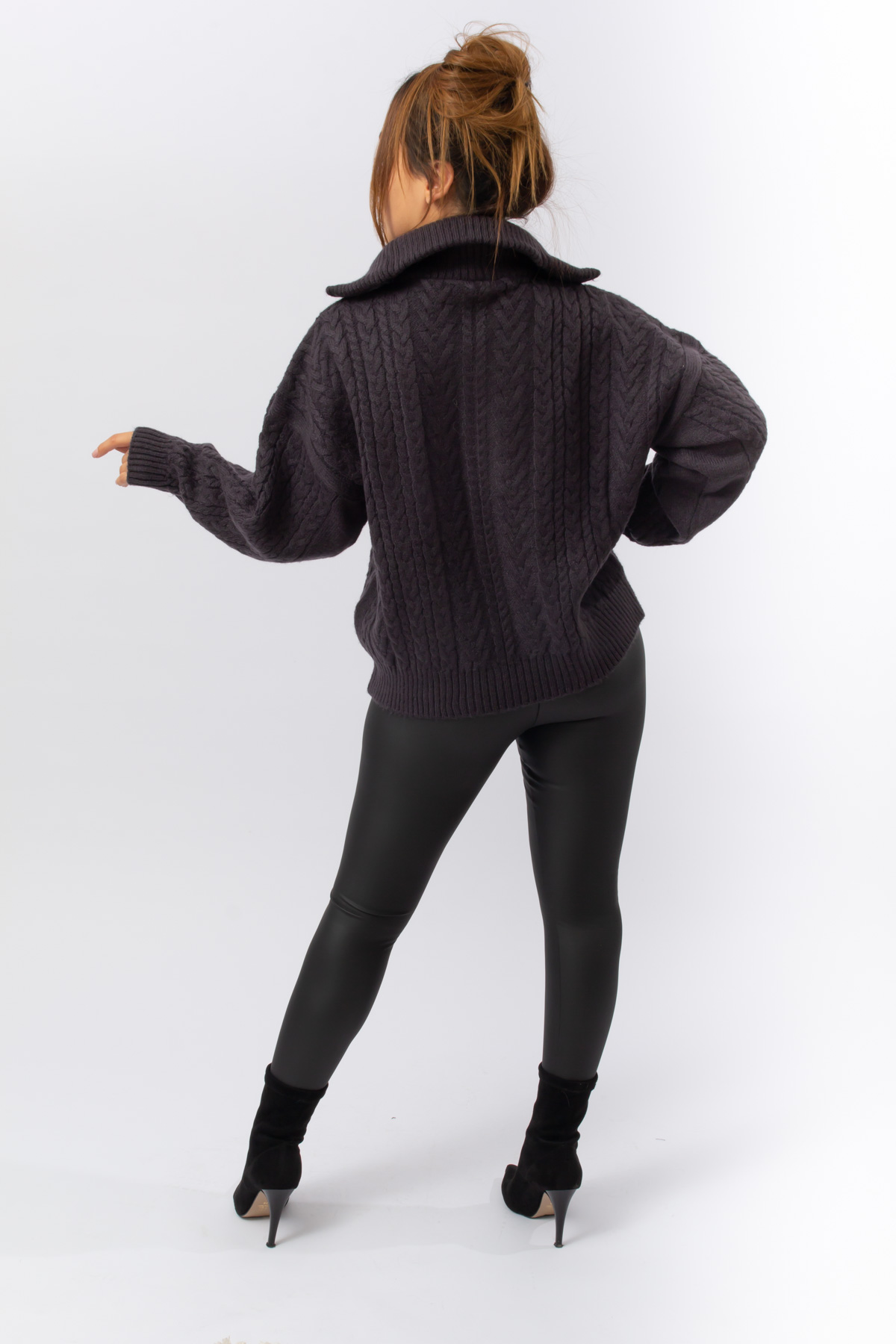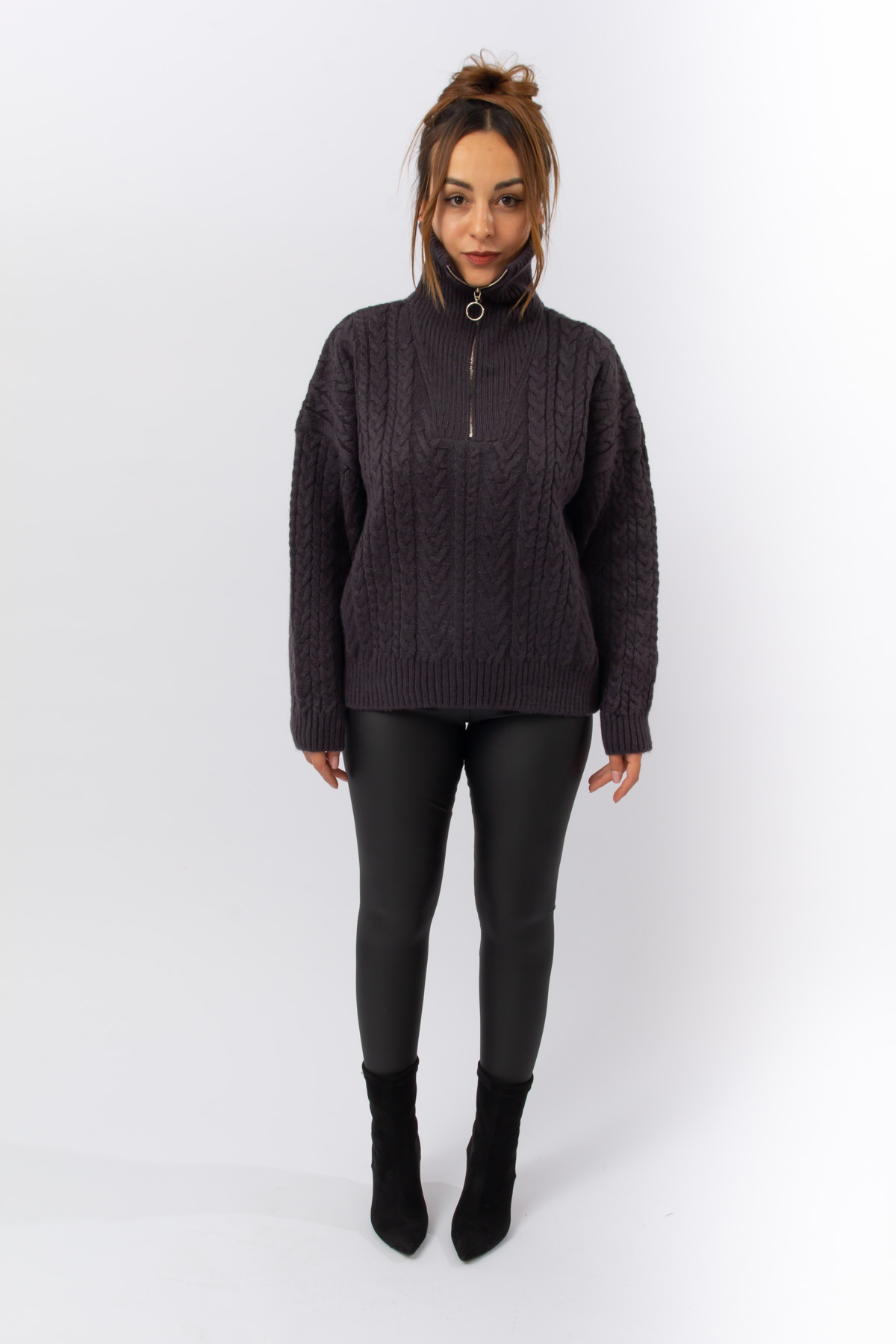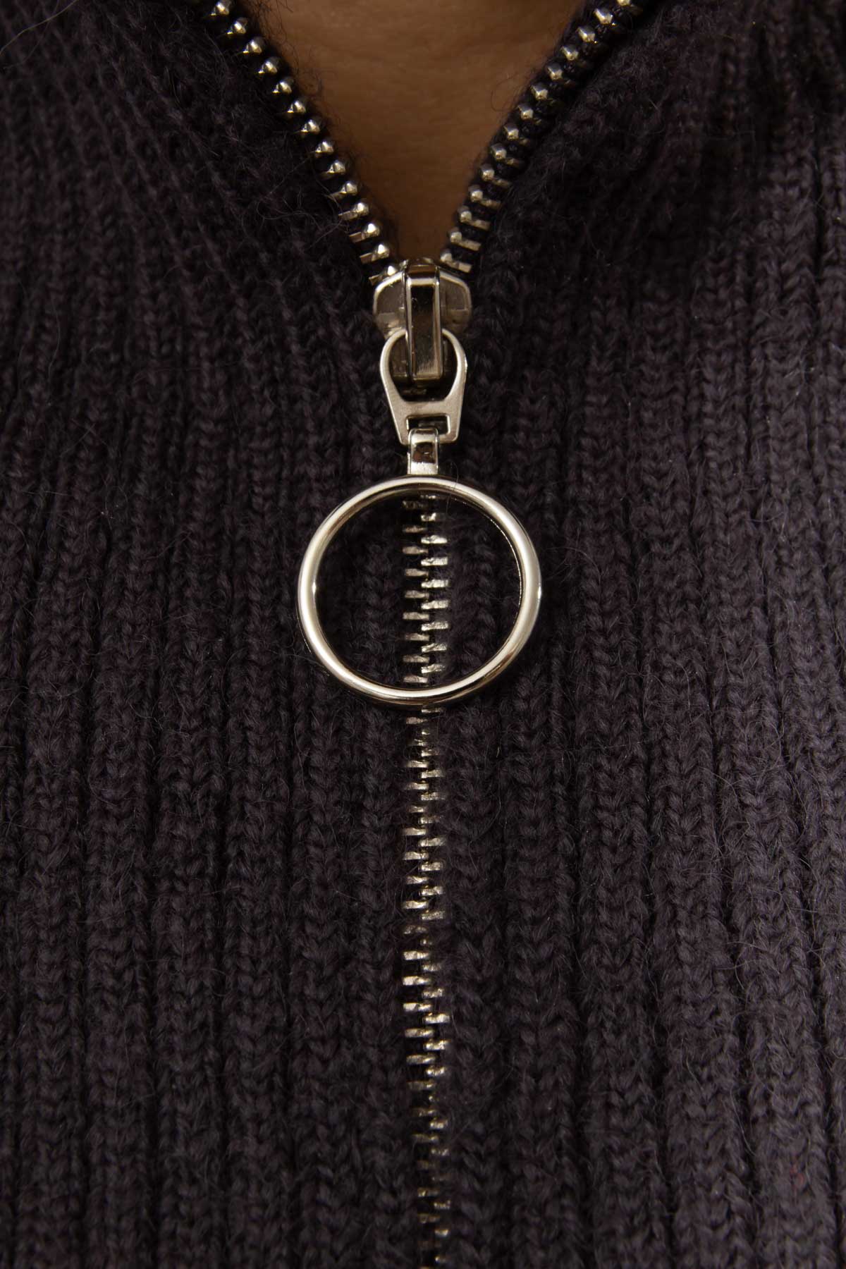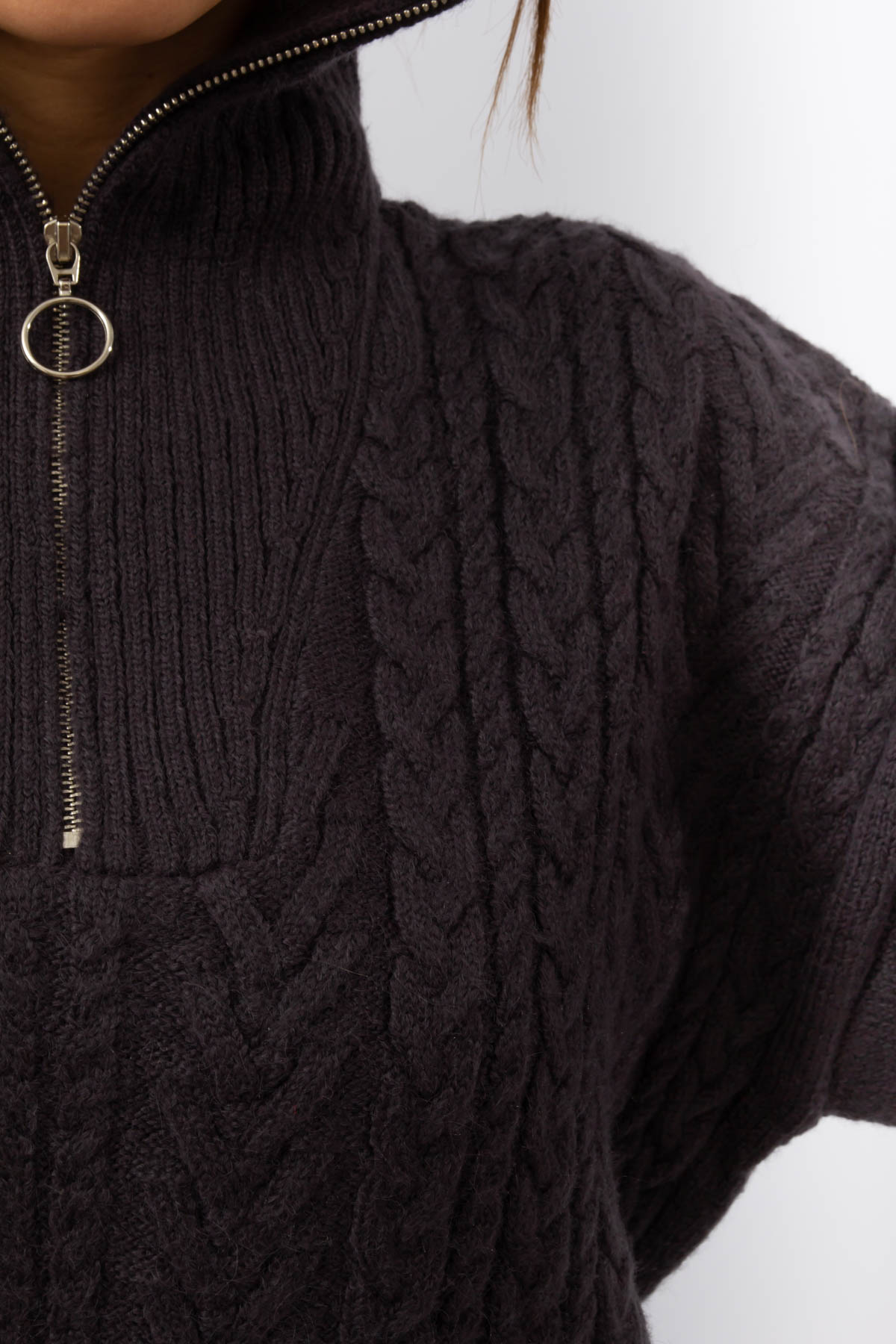 FÜME RENK FERMUARLI SAÇ ÖRGÜ KAMYONER YAKA KAZAK