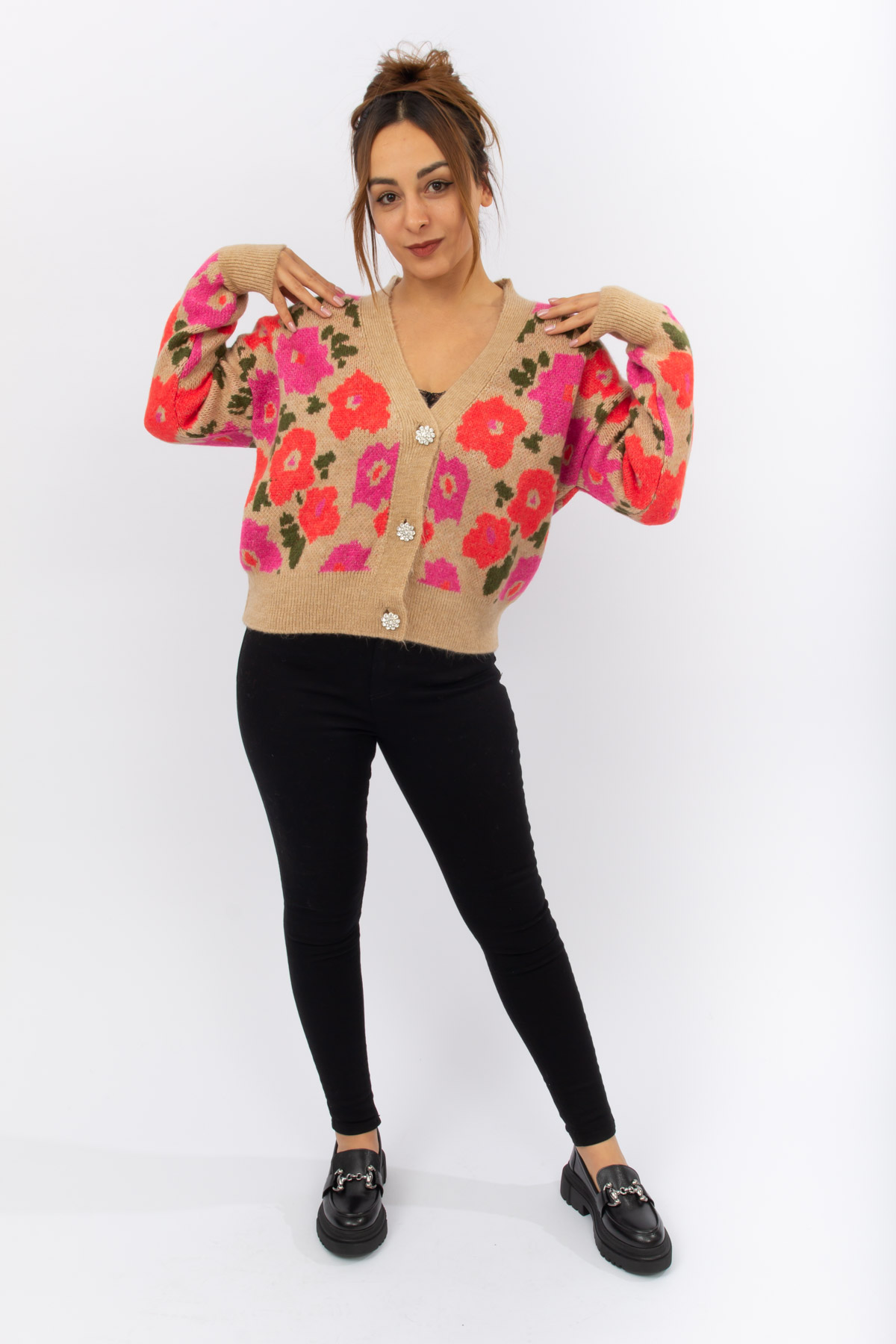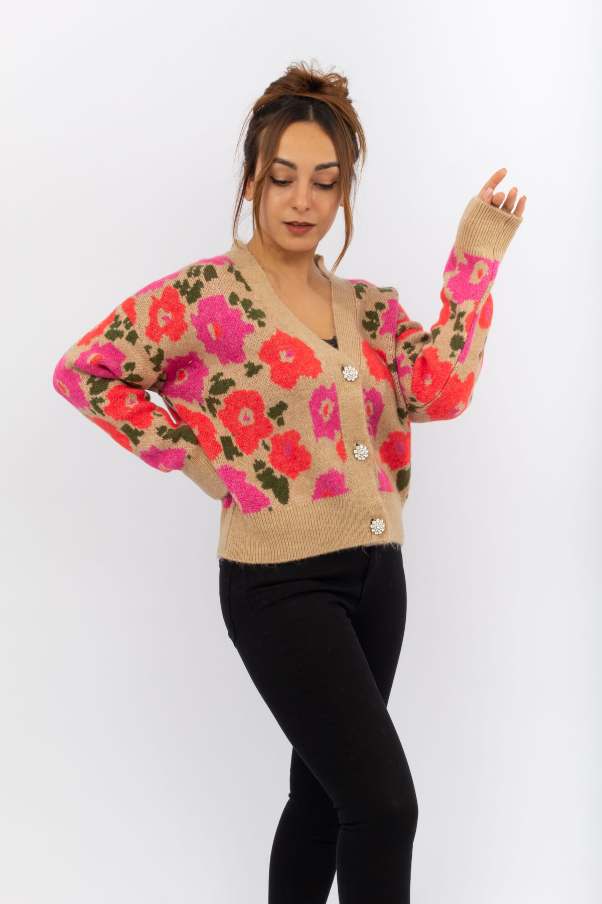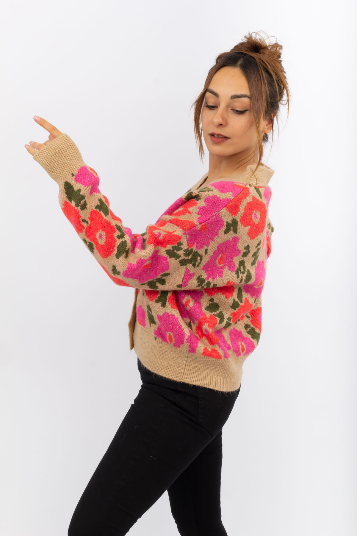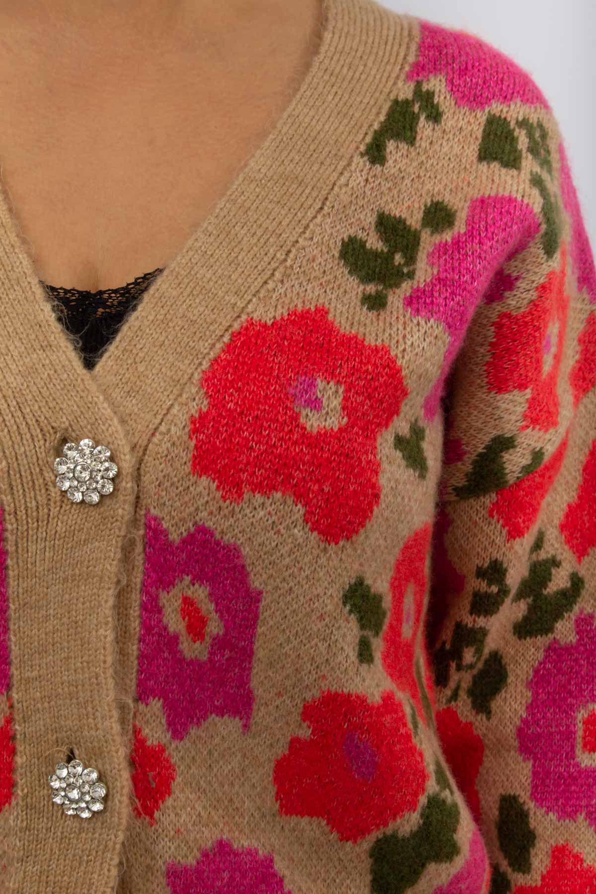 KOYU BEJ RENK YUMOŞ ÇİÇEK DESENLİ HIRKA