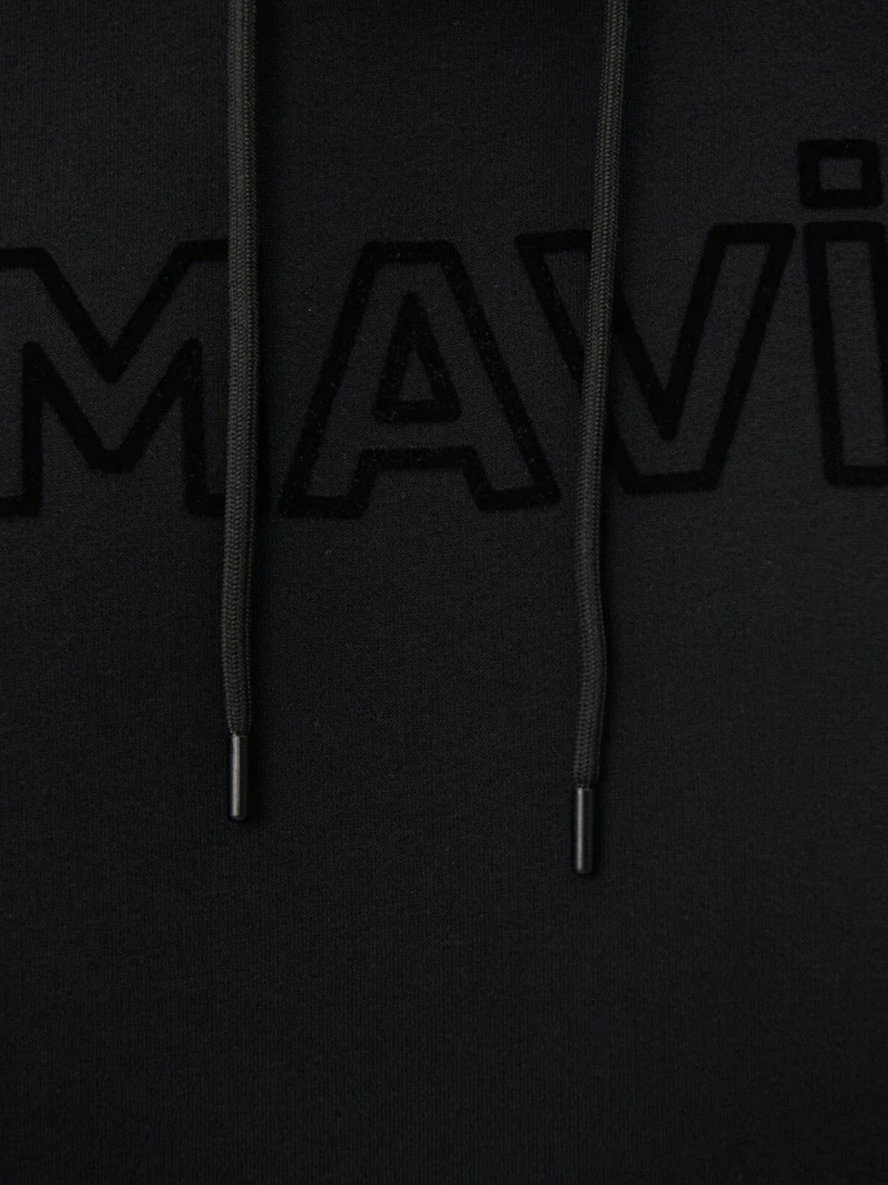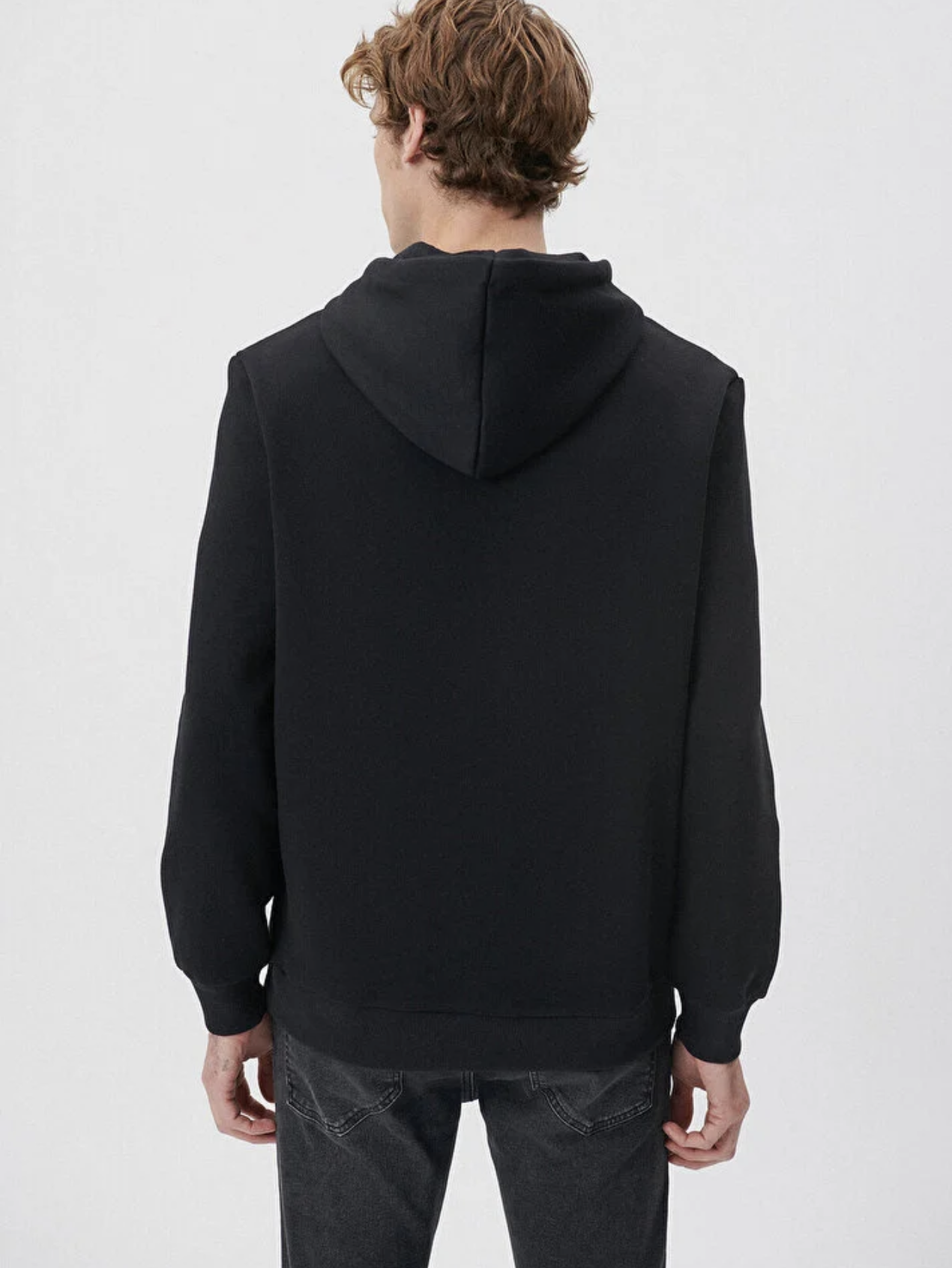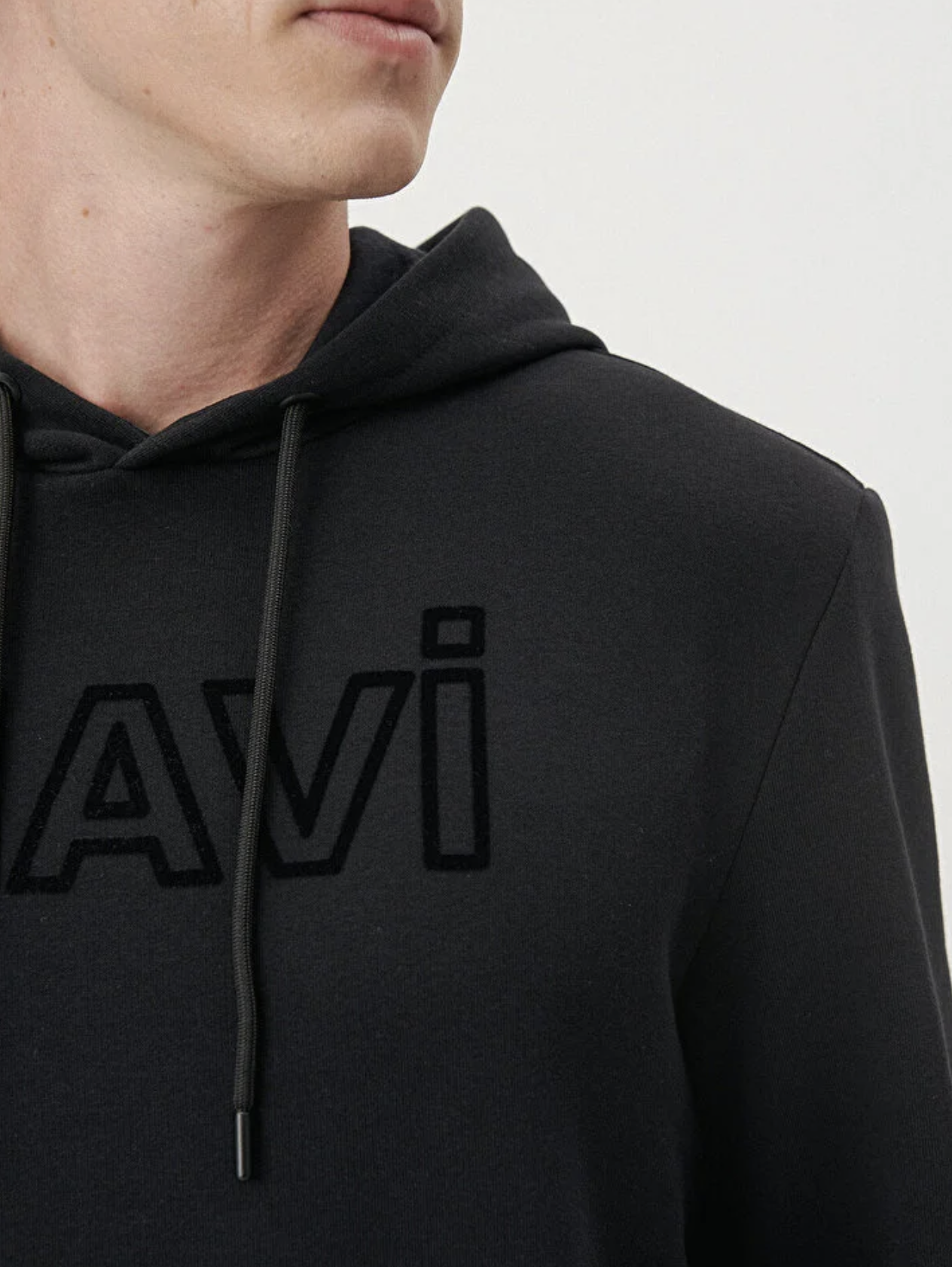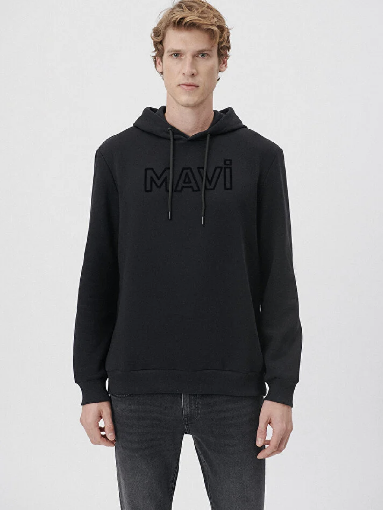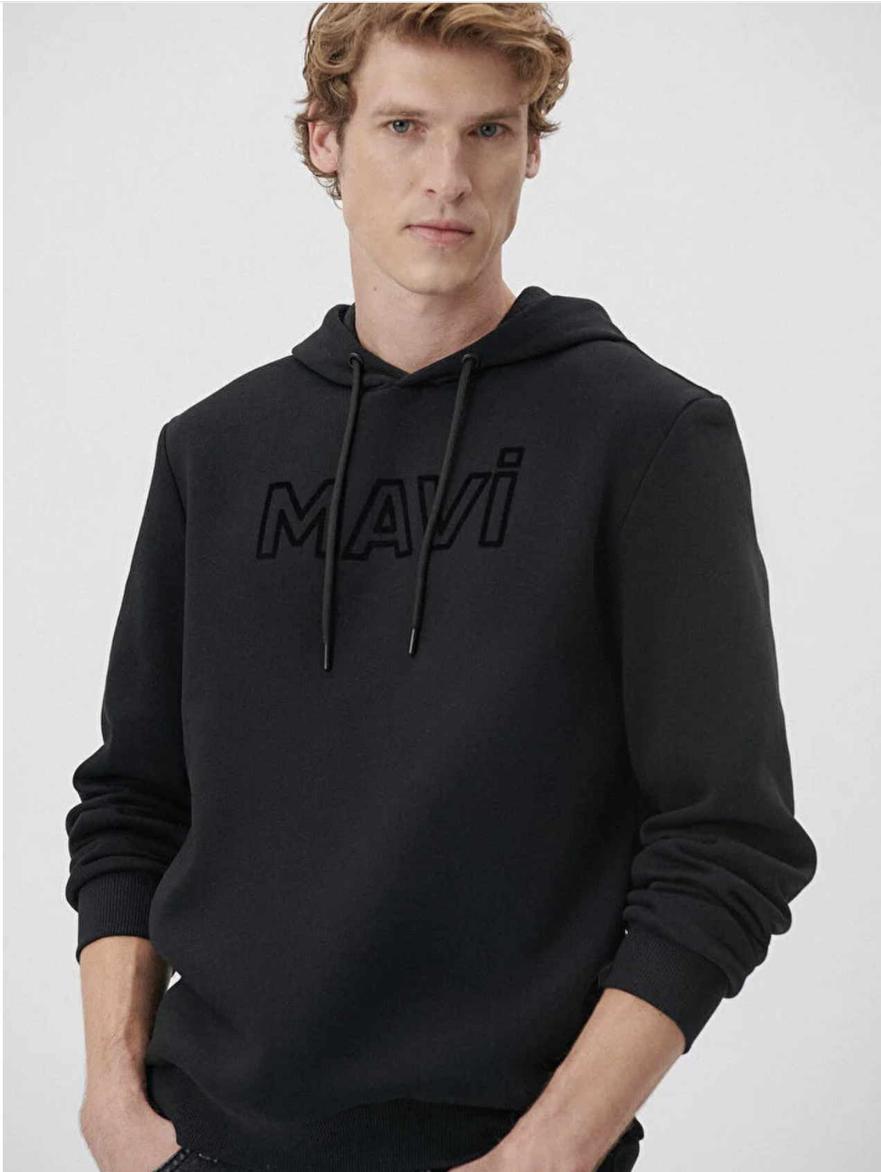 MAVİ LOGO BASKILI KAPÜŞONLU REGÜLER FİT SİYAH SWEATSHİRT