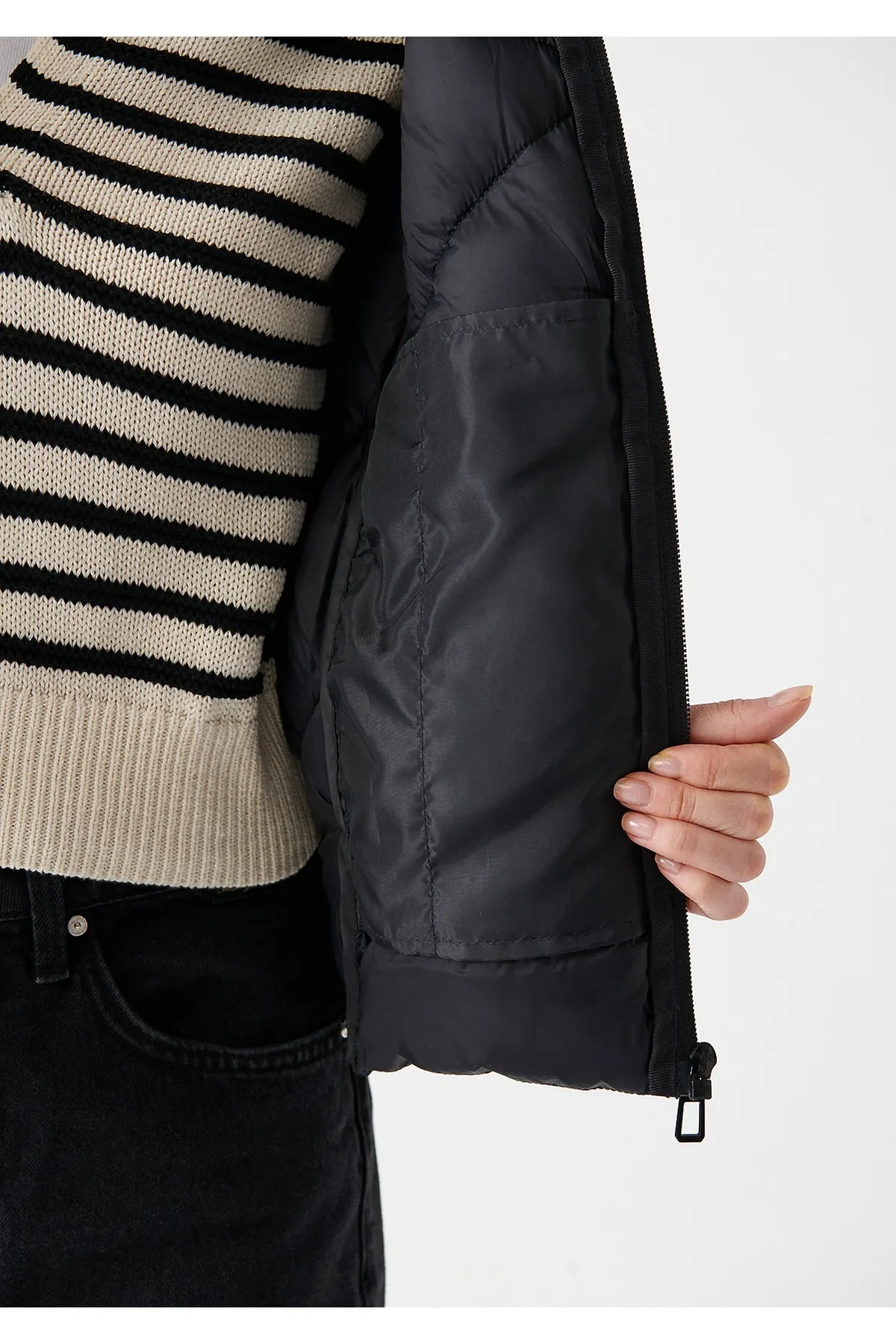 Suni Kürk Detaylı Siyah Şişme Loose Fit Mont