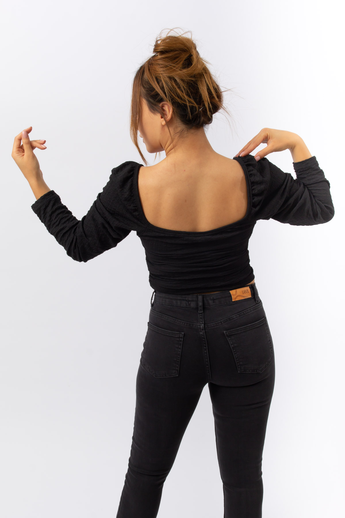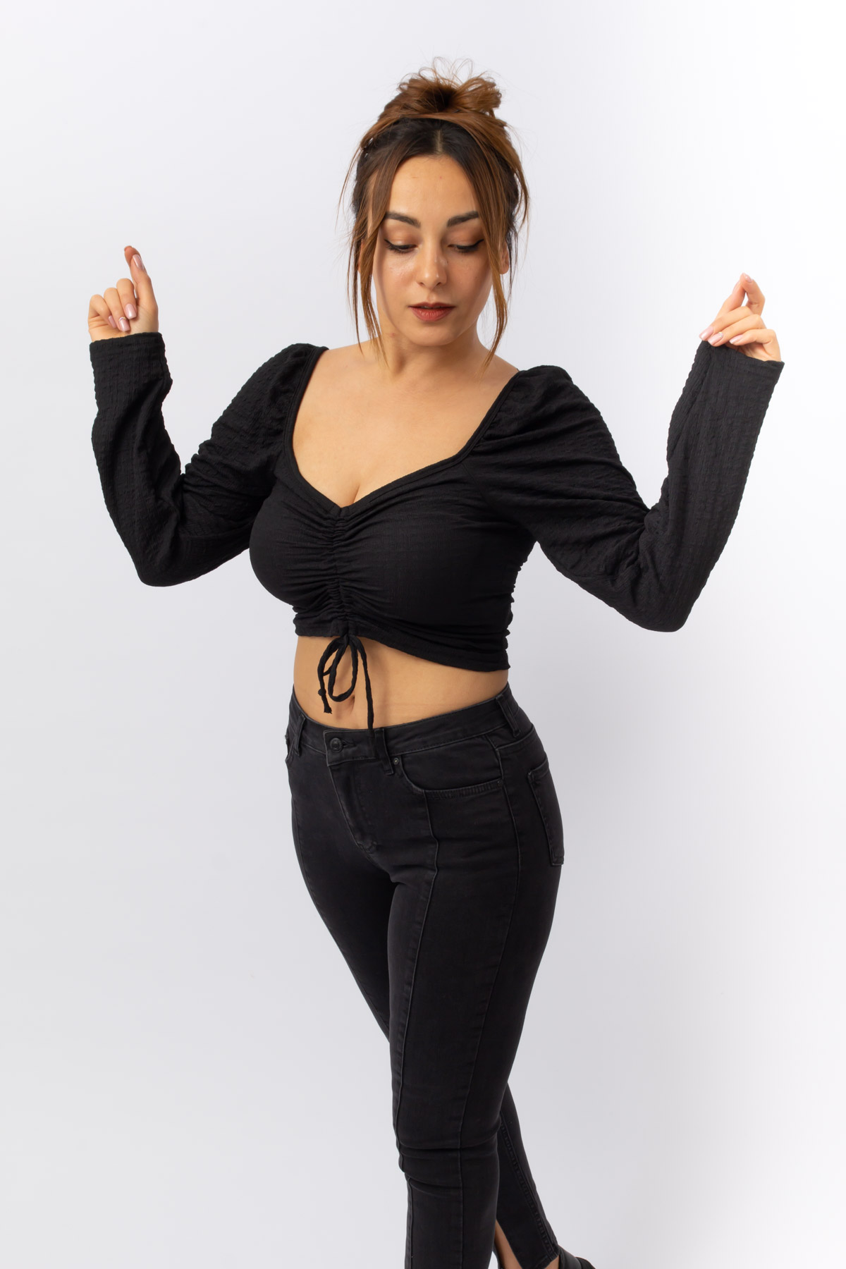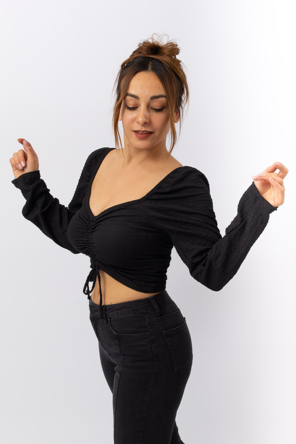 SİYAH RENK İP BÜZMELİ UZUN KOL CROP