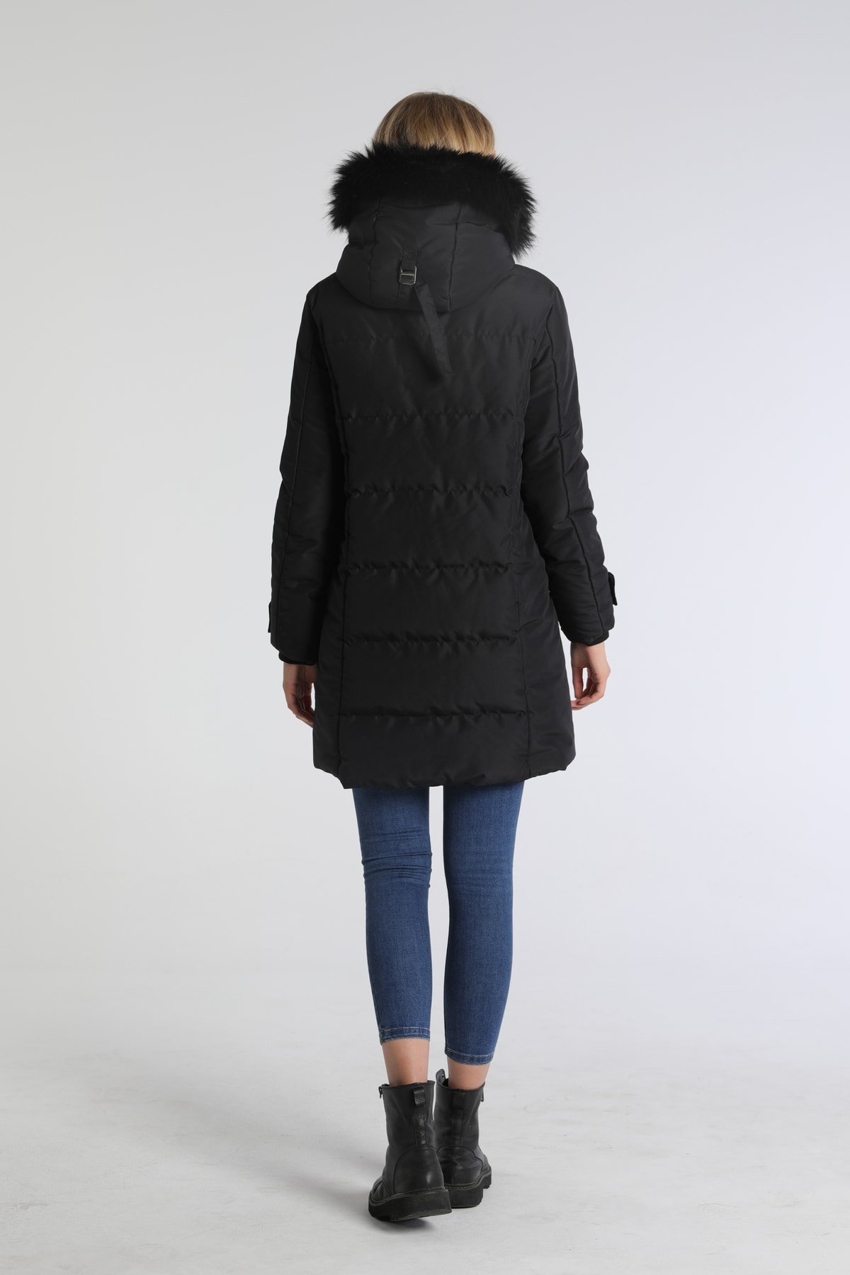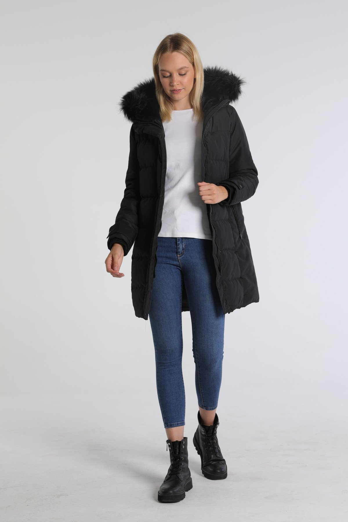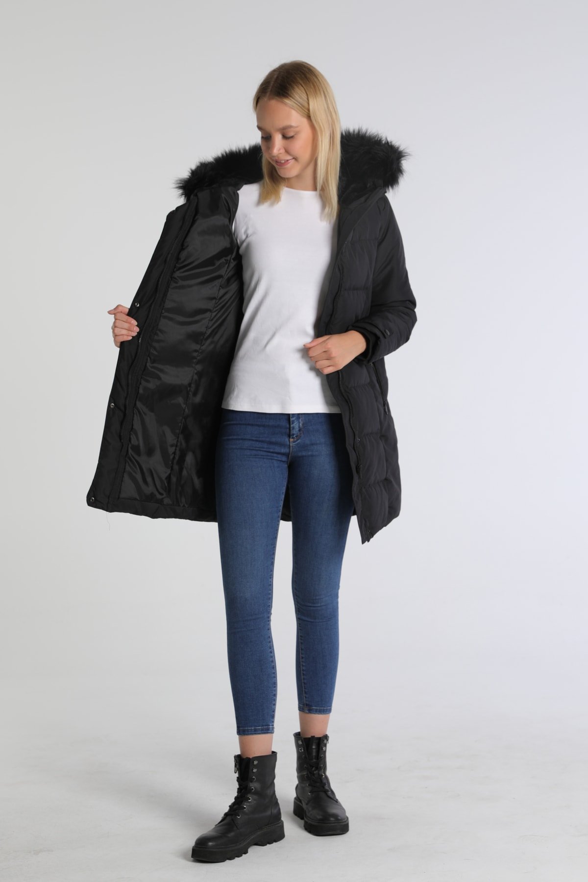 SİYAH RENK LİKRALI KAPÜŞONLU KÜRKLÜ MONT