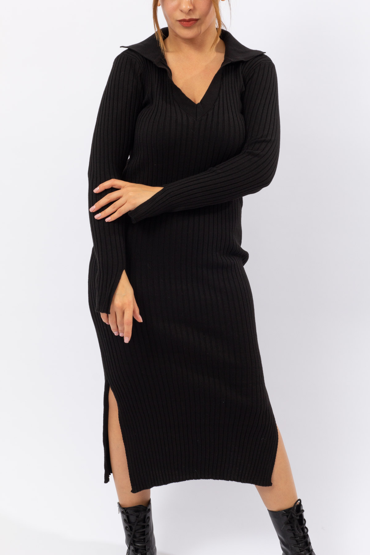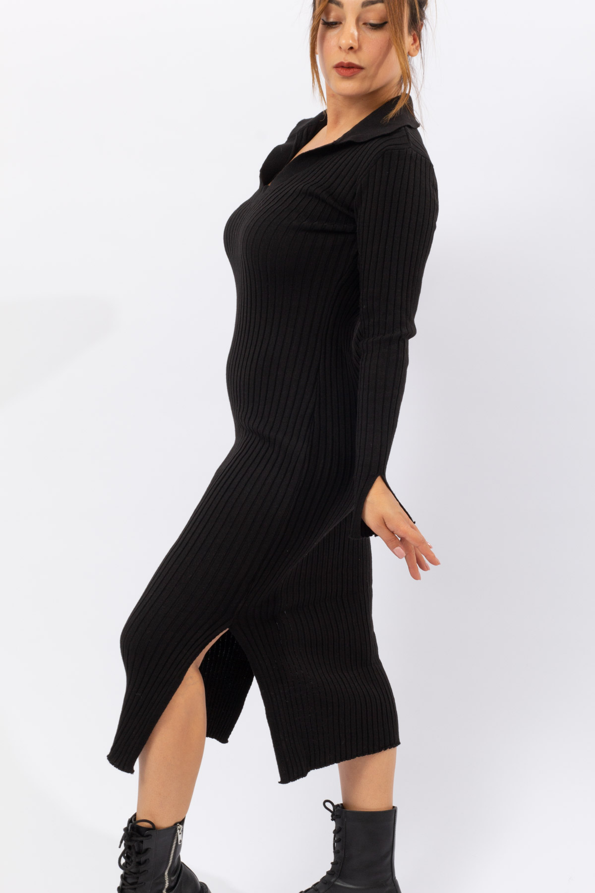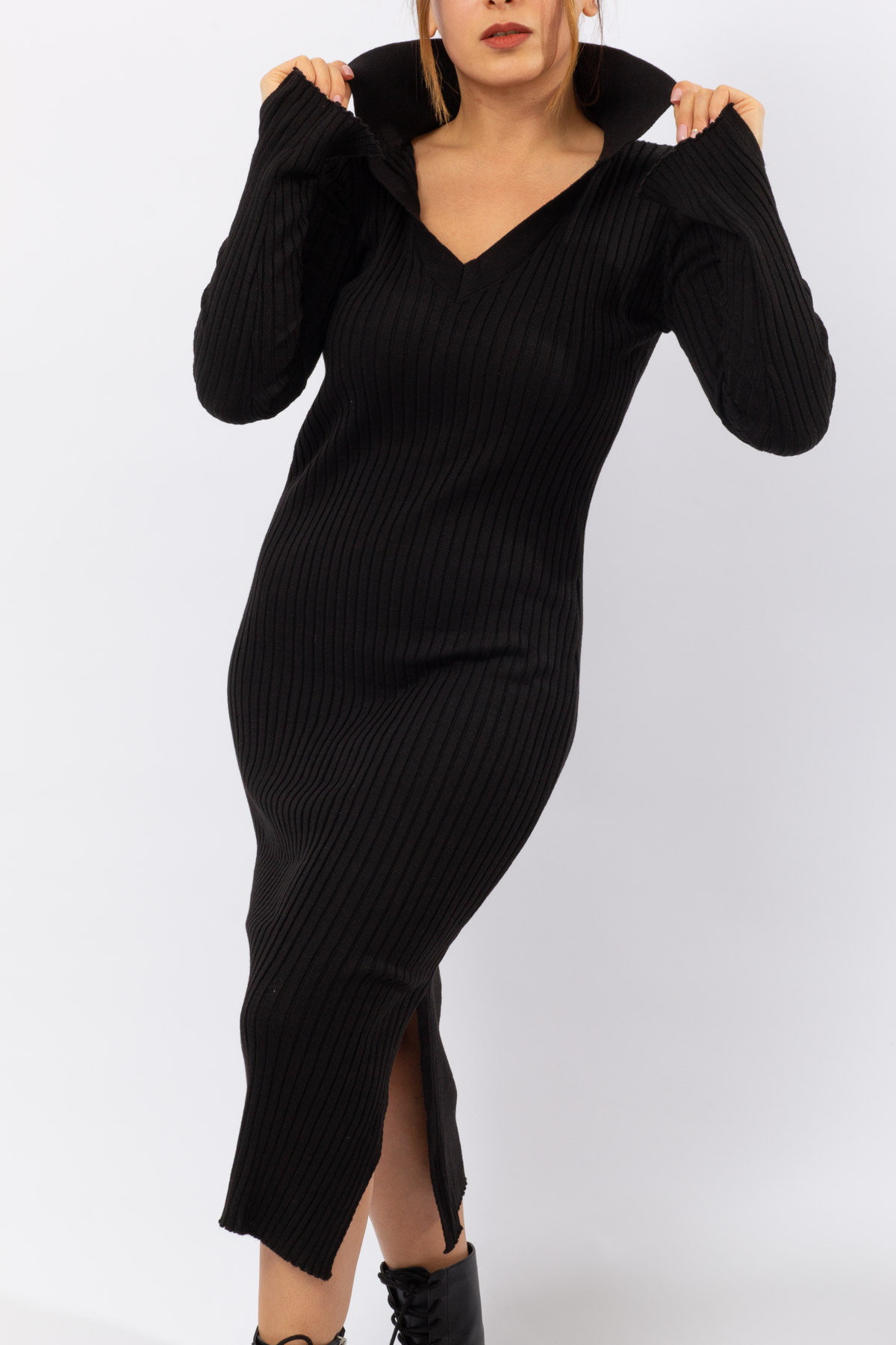 Siyah Renk Balıkçı Yaka Yırtmaçlı Triko Elbise