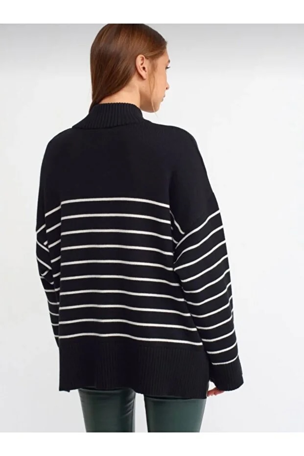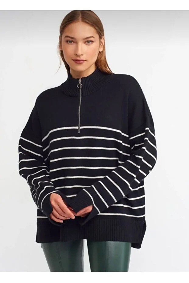 Yarım Balıkçı Fermuarlı Çizgili Kazak