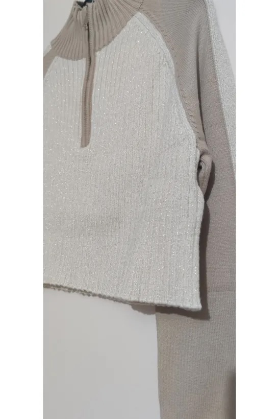 Krem Renk Fermuarlı Saç Örgü Kamyoner Yaka Kazak